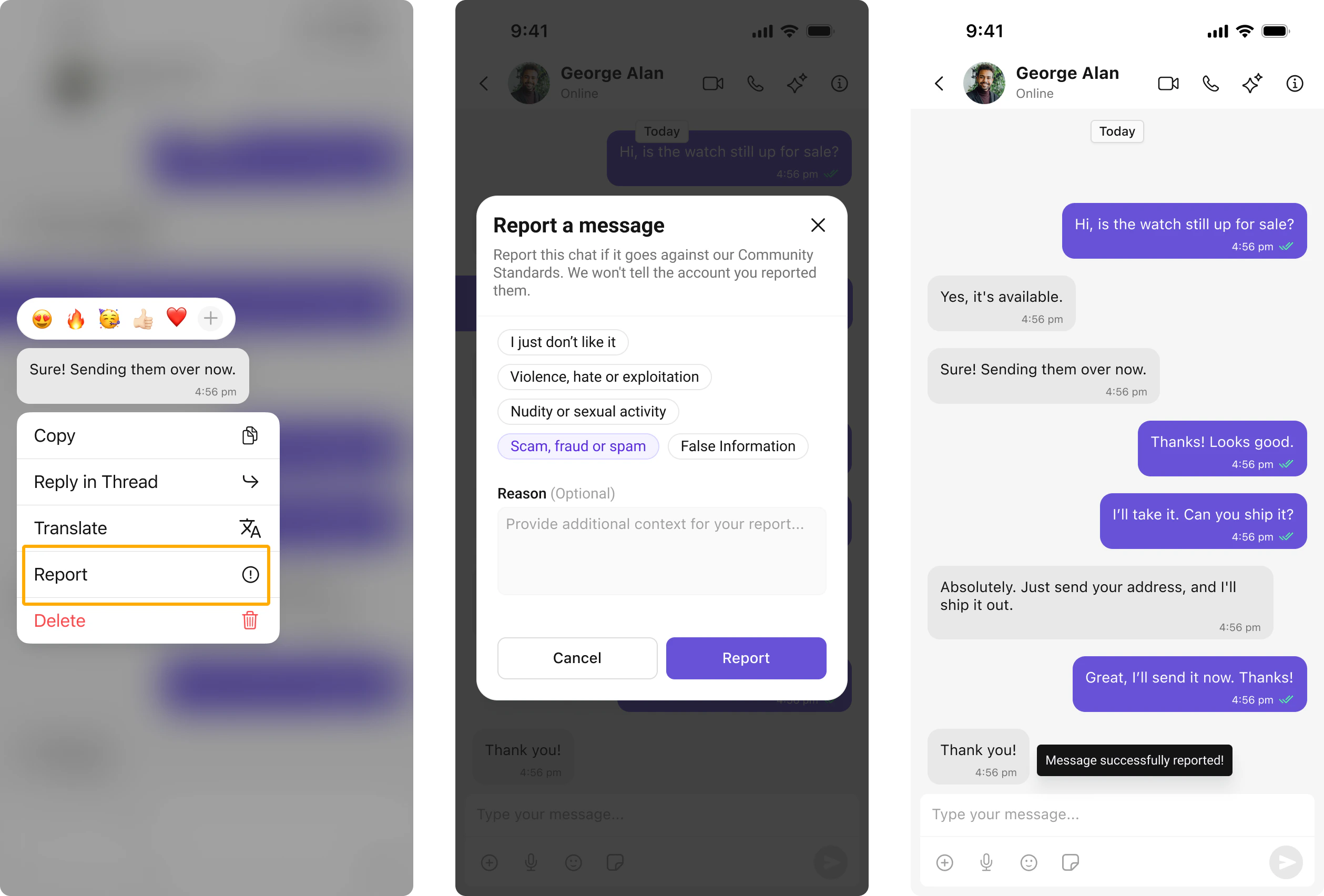 The Report Message feature is available in CometChat UI Kits. Users can report messages directly from the message actions menu: