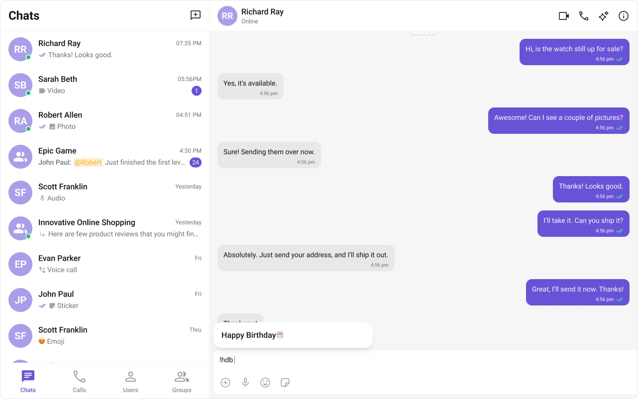 ShortCutFormatter extends CometChatTextFormatter to expand shortcodes (like !hb) into full text via the Message Shortcuts extension. When a user types a shortcut, a dialog appears with the expansion — clicking it inserts the text.